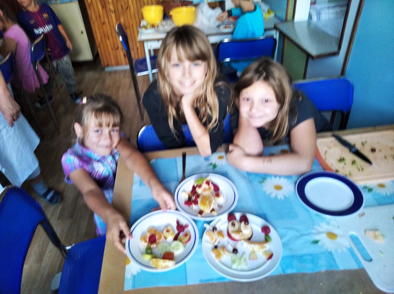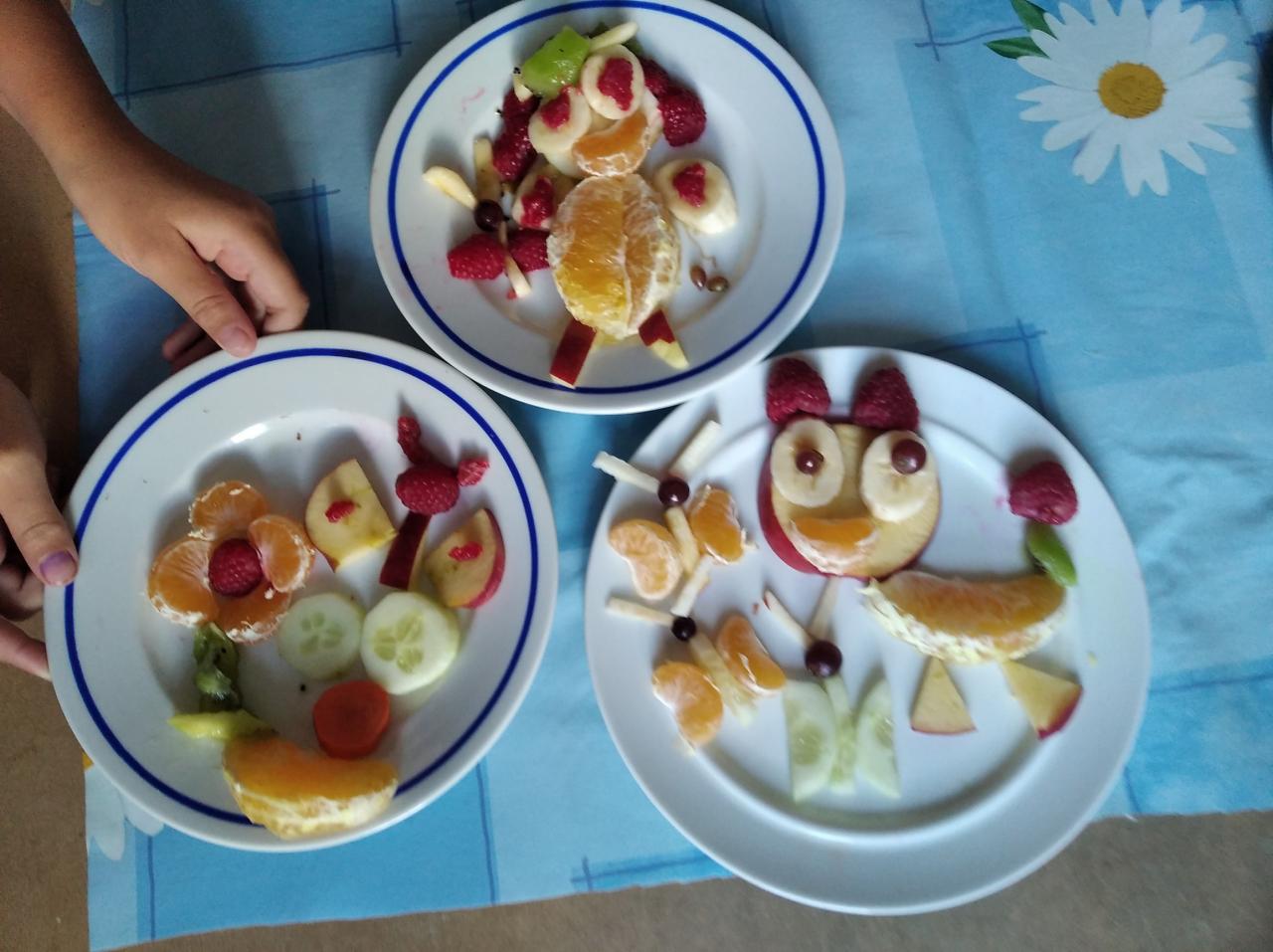 Děti si donesly ovoce a zeleninu, ze kterých si udělaly dekorativní svačinku. Na talířích se objevovala zajímavá zvířátka, sluníčka a kytičky. Nakonec si na svých dobrůtkách pochutnaly.
